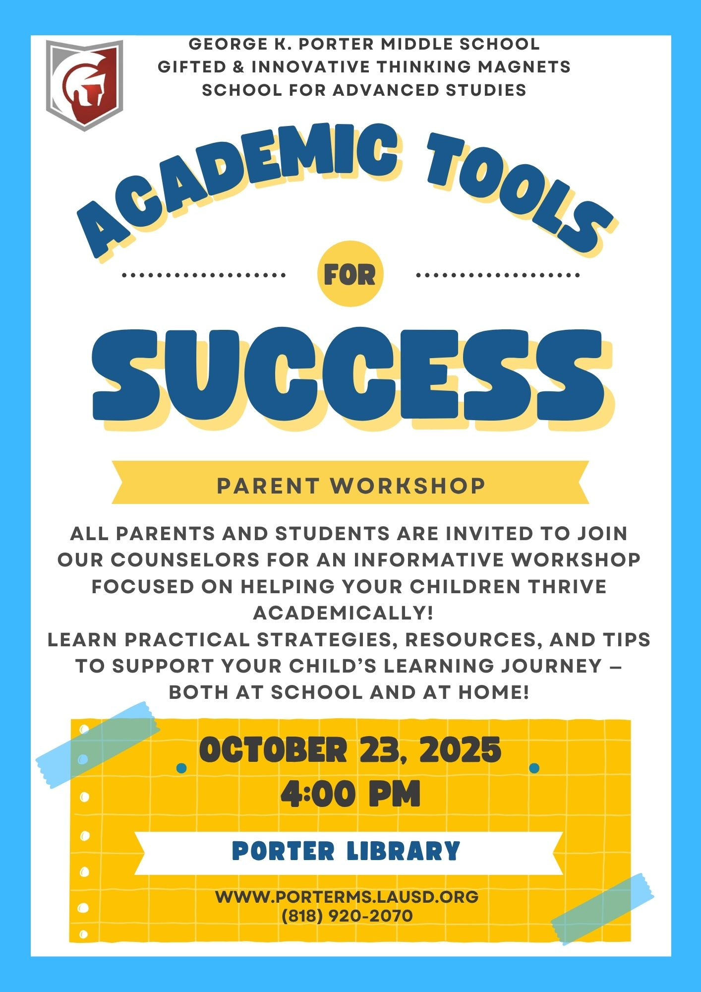 Parent Workshop: Academic Tools for Success Thursday 10/23/25 4:00 PM Library